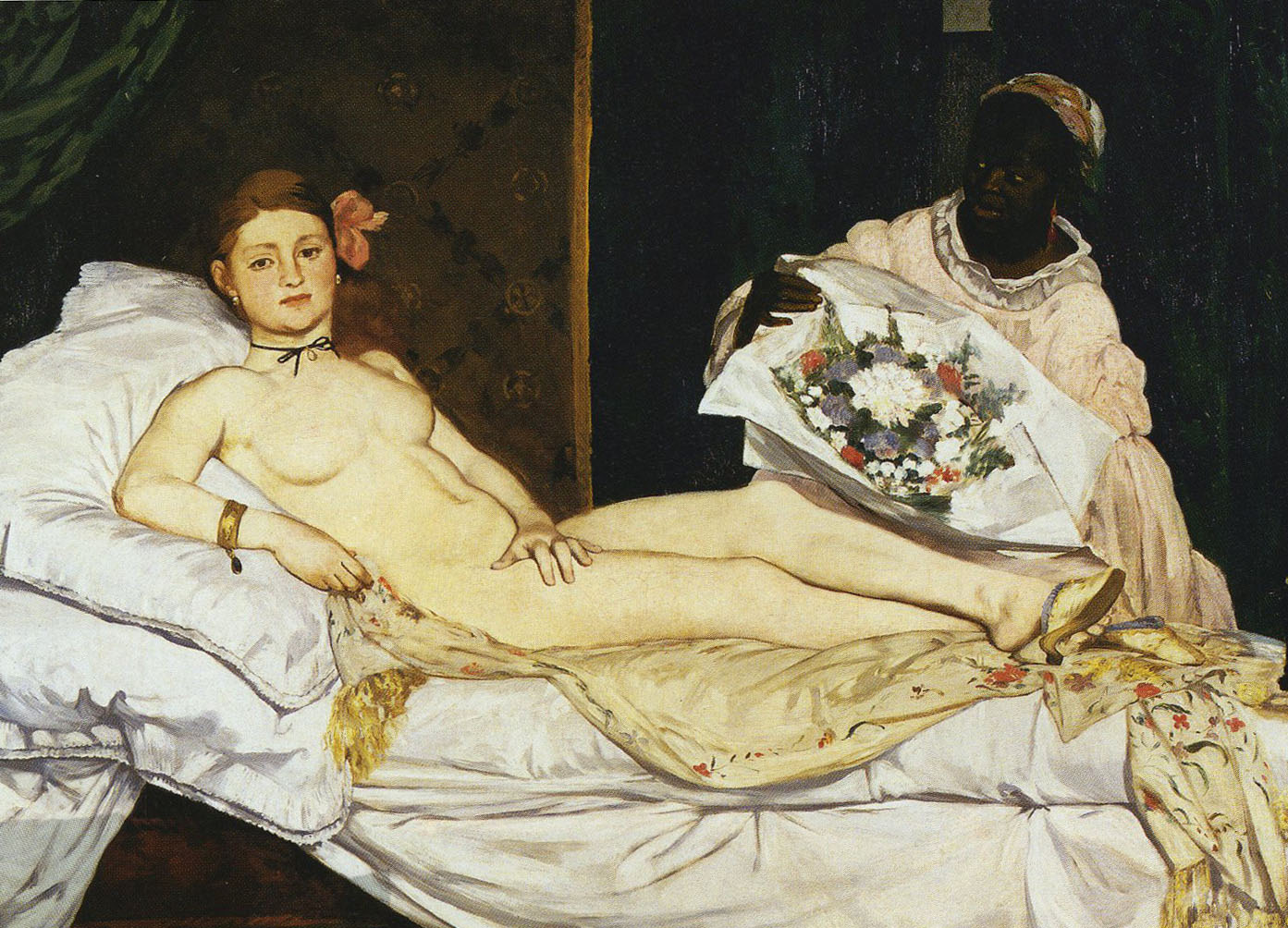 Manet’s Olympia is depicted (shockingly, for the time) fully naked as a contemporary courtesan, yet her expression is blank and her body is rendered flatly, expressly painted rather than ‘real’. The effect is to further distance the viewer.